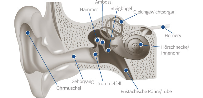 Musik, Kinderlachen, das Zwitschern der Vögel – und Sprache. Die Welt ist voller Klänge und Geräusche. Alle Laute, die wir als Töne, Geräusche oder gesprochene Worte wahrnehmen, werden als Schallwellen übertragen. Die Ohrmuschel funktioniert wie ein Trichter. Sie fängt die Schallwellen auf. Von hier aus werden sie über den Gehörgang an das Trommelfell weitergeleitet. Beim Auftreffen des Schalls gerät dieses in Schwingungen. Die winzigen Gehörknöchelchen Hammer, Amboss und Steigbügel verstärken die Schwingungen um das 20-fache und leiten sie an die Hörschnecke, das eigentliche Hörorgan, weiter. Rund 15.000 mit feinen Härchen ausgestattete Sinneszellen nehmen die Schwingungen auf, wandeln sie in elektrische Impulse um und übertragen diese an den Hörnerv. Im Gehirn werden die elektrischen Signale entschlüsselt und als Höreindruck – musikalische Klänge, Vogelgezwitscher oder gesprochenes Wort – erkannt.